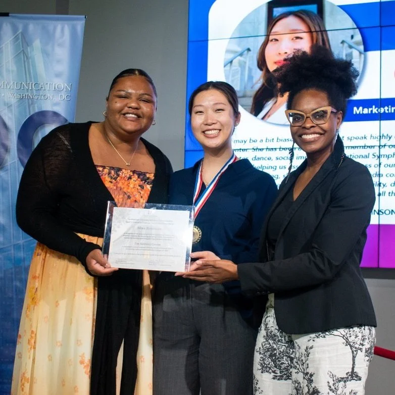 In picture (L-R): Mika Robinson, Assistant Marketing Manager at The Kennedy Center; Kelly Ma, Marketing Strategy Intern at The Kennedy Center; Marnel Niles Goins, Dean of The School of Communications.